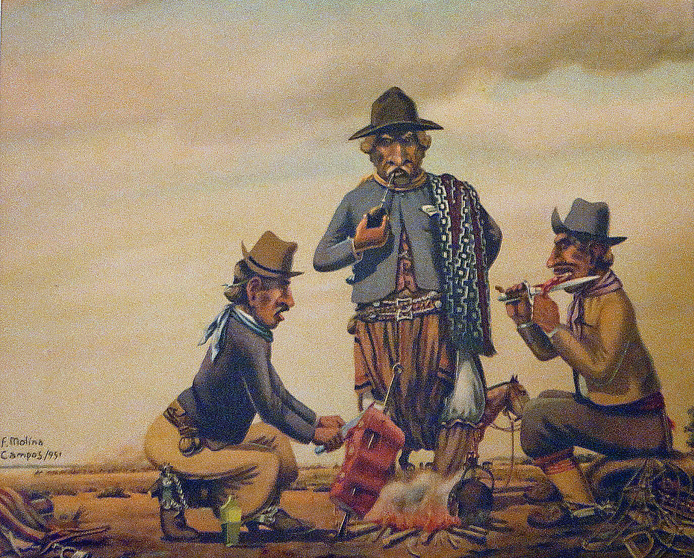 Gauchos barbequeueing their evening meal. Note the one on the right is holding the meat between his teeth and his left hand, while his right hand holds the knife or facón and slices it away from his hand. This is the traditional way of eating beef when plates are not available, or simply because they are outdoors.